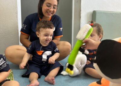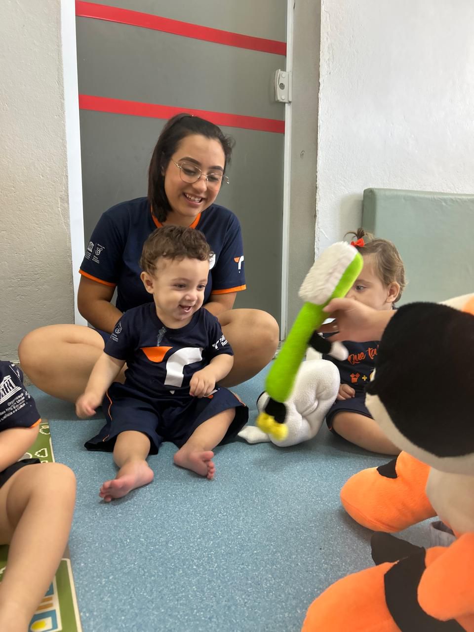 Com os alunos do B1 e B2, foi feita uma interação com o Tigrão (fantoche com dentes) e com bonecos de higiene bucal, de dente e do Dr. Prof, incentivando a escovação de forma divertida.