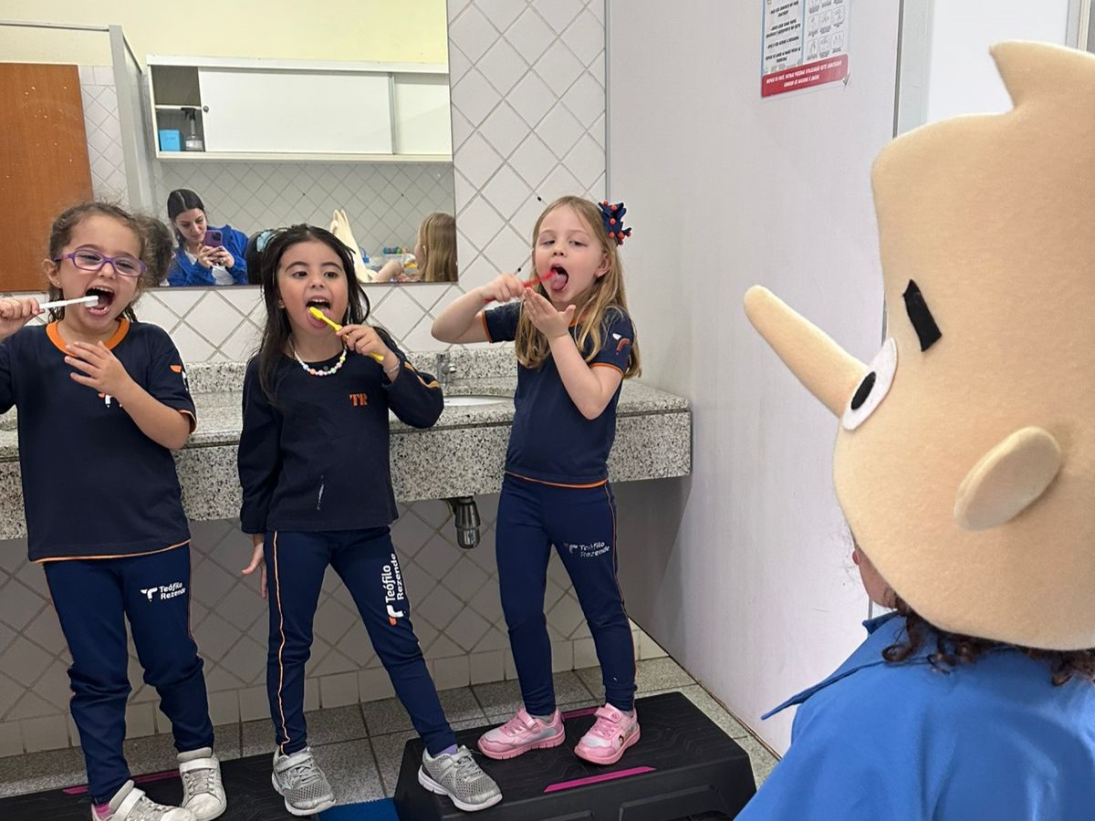 A @turmadrprof utiliza diversos recursos didáticos para ensinar as crianças, de forma envolvente e significativa, a técnica da escovação e o uso do fio dental.