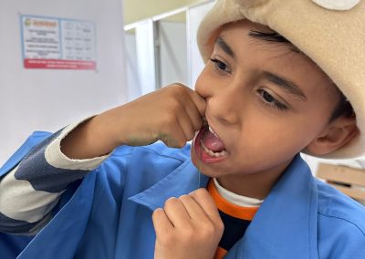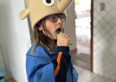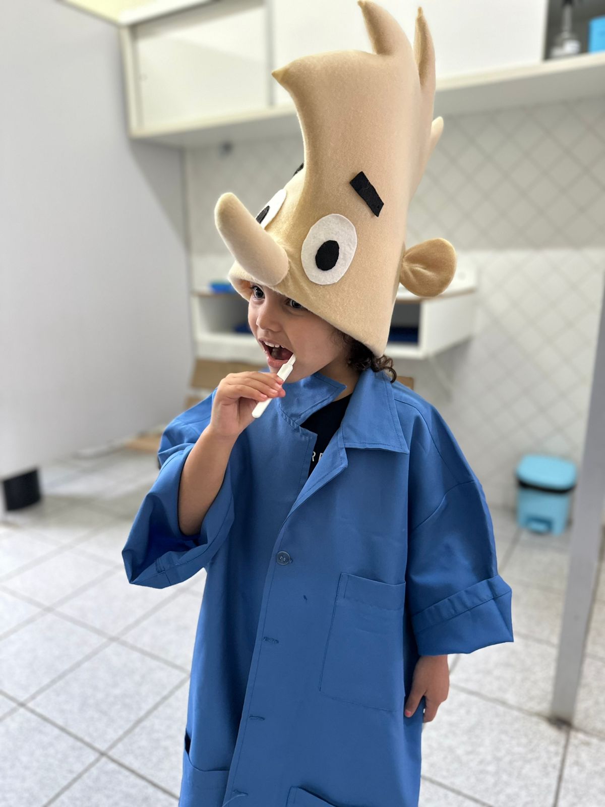 Um deles é transformá-las no nosso personagem Dr. Prof, para que possam ensinar os colegas, momento especial de troca e de resgate do aprendizado que a dentista trabalha com elas toda semana.